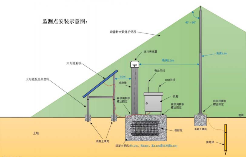 方式一:尾矿库坝体上安装的北斗Ⅲ位移监测设备,坝体上安装了多个位移监测点上,或变电站、配电所的楼顶,或电力铁塔上安装北斗基准站。展示的是在山体基岩上设置的基准站。基准站坐标已知,并长期保持稳定。基准站接收北斗卫星数据,并通过电台或4G通信模块将差分数据发送至导线上的北斗监测点装置,供差分定位解算,以得到导线的高精度坐标。基准站采用太阳能供电,配备200Ah磷酸铁锂蓄电池,和400W太阳能板,以保证在连续阴雨情况下,可持续20以上天稳定供电。